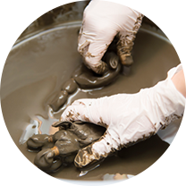 晶子染めは、片山津柴山潟の湖底土と片山津温泉の源泉を使った泥染め。